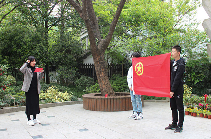 活动一开始,同学们在历史馆的大型石雕前一起重温入团誓词。同学们举起右拳,面向团旗,郑重宣誓。整个宣誓过程仿佛在与革命先烈进行一场跨越时空的“对话”,一声声的誓词都传递对先烈的一份感恩与铭记。